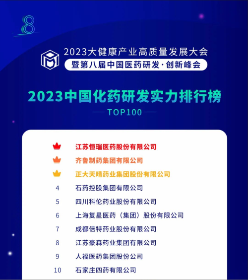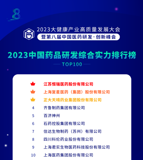 由药智网、中国药业杂志社主办的2023大健康产业高质量发展大会暨第八届中国医药研发•创新峰会于6月16日开幕,会上发布了《2023中国药品研发实力排行榜》系列榜单,凯时官网医药凭借深厚的创新研发实力再创辉煌:荣登《2023中国药品研发综合实力排行榜TOP100》榜首、《2023中国化药研发实力排行榜TOP100》榜首。值得一提的是,今年是凯时官网医药连续第6年入选《中国药品研发综合实力排行榜》榜首。